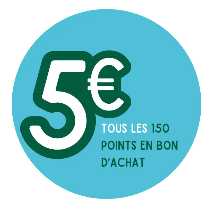 Cumulez vos achats et transformez-les en avantages : tous les 150 points, recevez 5€ en bon d’achat.